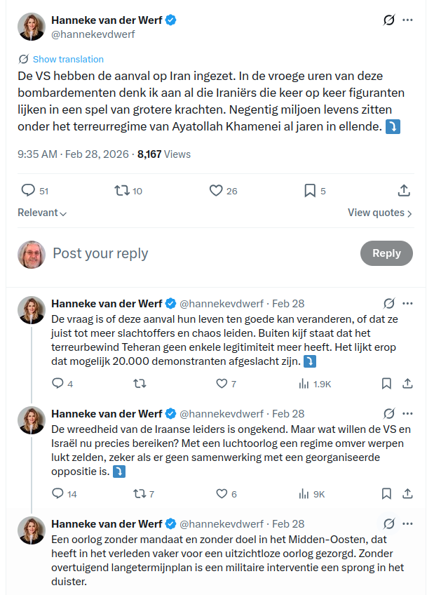 ’s Ochtends verschijnt er een draadje op X over Iran. Grote woorden, keurige zinnen, morele verontwaardiging. Enkele uren later wordt haar gevraagd wat ze daarvan vindt.